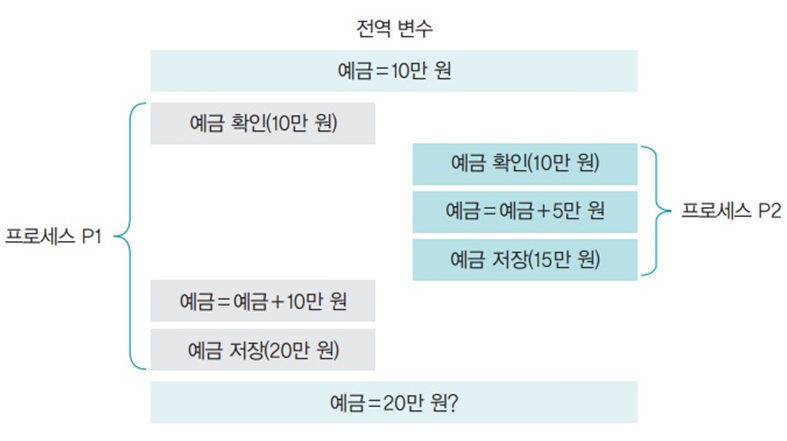 프로세스 A와 프로세스 B가 동시에 접근해 타이밍이 서로 꼬여 정상 결괏값은 25인데 20이 출력된다.