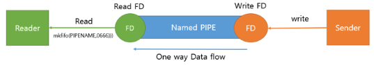 이름을 가진 PIPE를 통해서 프로세스들 간에 단방향 통신을 지원한다. 서로 다른 프로세스들이 PIPE의 이름만 알면 통신이 가능하다.