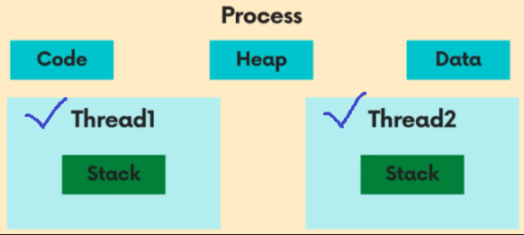 - 코드, 데이터, 스택, 힙을 각각 생성하는 프로세스와 달리 스레드는 코드, 데이터, 힙은 스레드끼리 서로 공유하고 그 외의 영역은 각각 생성된다.