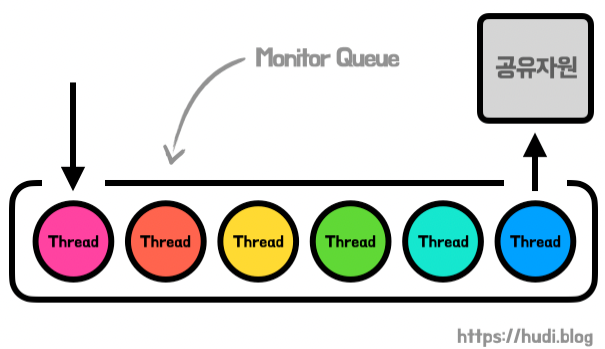 - 모니터는 모니터큐를 통해 공유 자원에 대한 작업들을 순차적으로 처리한다.