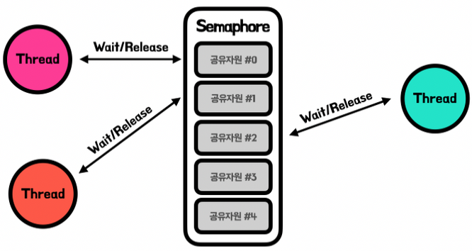 - 프로세스가 공유 자원에 접근하면 세마포어에서 wait( )작업을 수행하고 프로세스가 공유 자원을 해제하면 세마포어에서 signal( )작업을 수행한다.