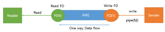프로세스 간에 FIFO 방식으로 읽히는 임시 공간인 파이프를 기반으로 데이터를 주고받으며, 단방향 방식의 읽기 전용, 쓰기 전용 파이프를 만들어서 작동하는 방식