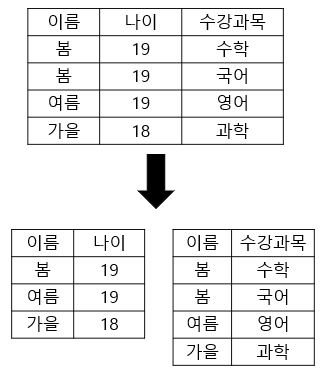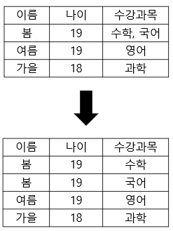 - 수강과목컬럼에서 봄이 수학과 국어 속성값 두 개를 가지고 있기에 이를 분리한다.