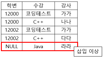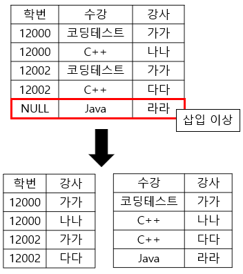 - 예시를 보면 {학번, 수강} 또는 {학번, 강사}가 후보키가 되며, 만약 다다라는 강사가 Java라는 수강명을 담당한다고 했을 때 이를 삽입하면 학번이 NULL이 되는 문제점이 발생한다.