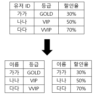 - 제 3정규화를 거치면 등급 릴레이션과 할인율 릴레이션으로 나뉘게 된다.