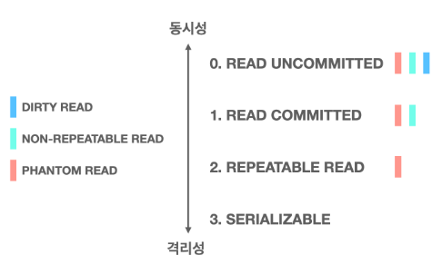 위로 갈수록 동시성이 강해지지만 격리성은 약해지고, 아래로 갈수록 동시성은 약해지고 격리성은 강해진다.