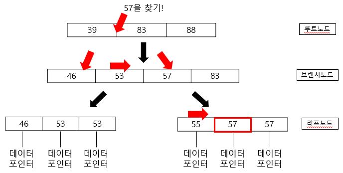 - 이렇게 루트 노드부터 시작해 마지막 리프 노드에 도달해서 57이 가리키는 데이터 포인트를 통해 결괏값을 반환하게 된다.