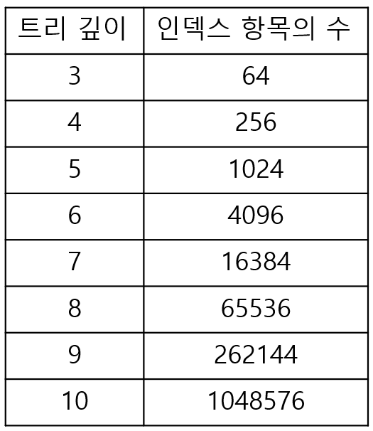 기본적으로 인덱스가 한 깊이씩 증가할 때마다 최대 인덱스 항목의 수는 4배씩 증가한다.