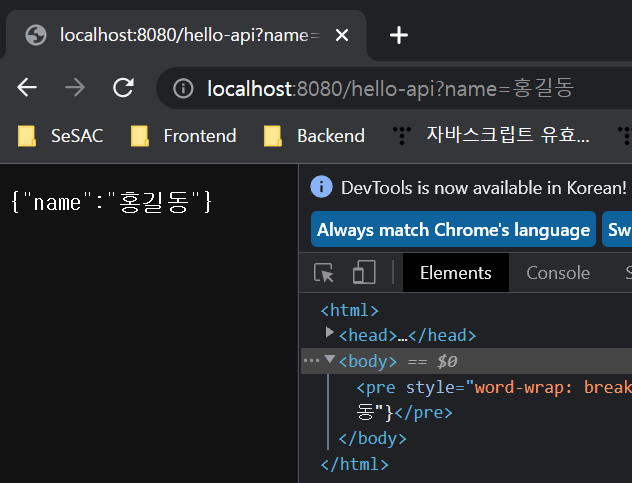 hello 클래스를 사용하기 위해 helloApi라는 getMapping할 메서드를 만들고 객체 생성한다.