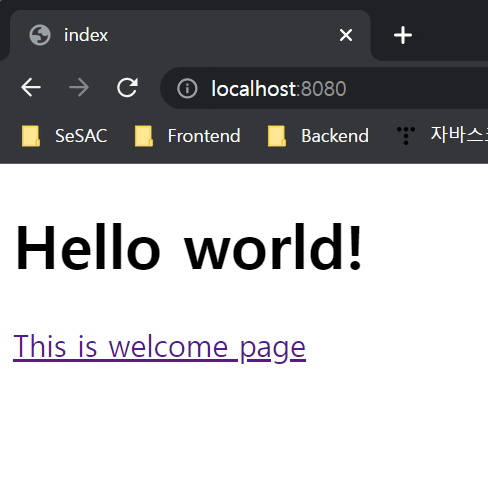 -> 잘 성공이 됐다면 1) Welcome Page로 가서 a태그로 감싼 This is welcome page를 누르면 저절로 2) localhost:8080/hello 페이지로 이동할 수 있게 된다!