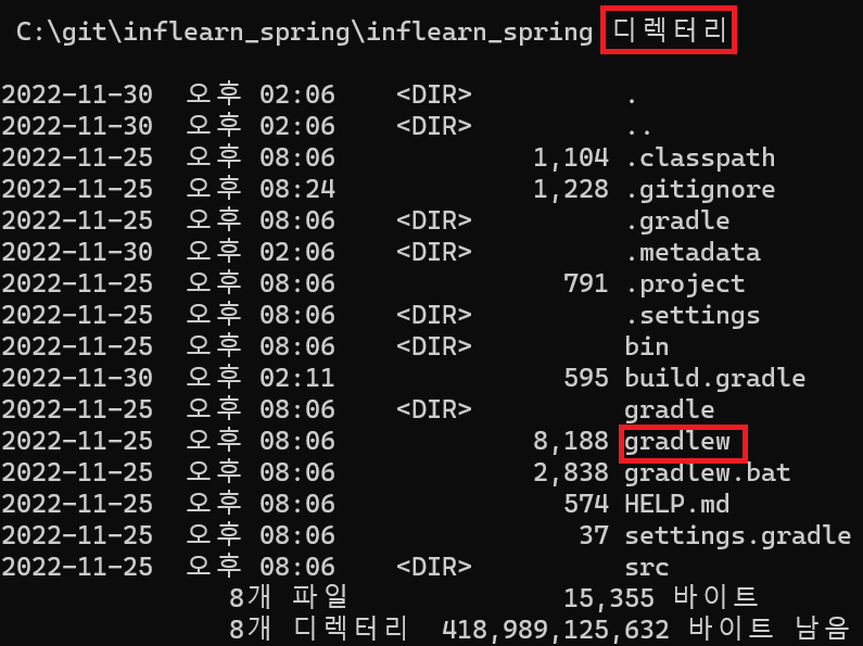 해당 프로젝트 폴더로 이동후(cd 명령어 이용) dir 명령어를 통해 gradlew 파일 확인