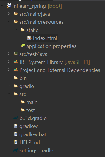 src/main/resources static 폴더안에 index.html을 만든 후 서버를 실행하면 잘 뜨는 것을 확인할 수 있다.