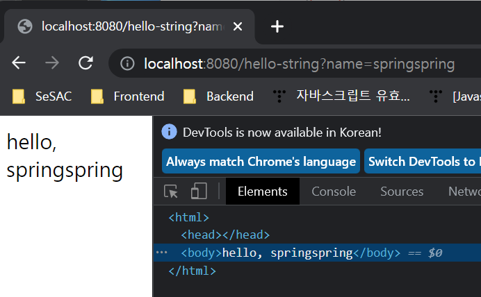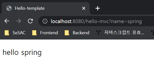 url에 http://localhost:8080/hello-mvc?name=spring 적게 되면 (name을 적지 않으면 오류! 클라이언트단에서 받게되는 name이 없기 때문에 오류가 생기는 것)