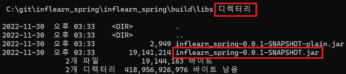 dir 명령어를 통해 ~~ SNAPHOT.jar 파일 확인