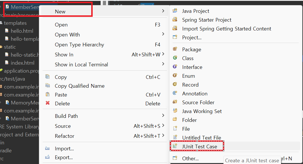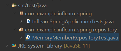 src/test/java에 repository 패키지 생성 뒤 MemoryMemberRepositoryTest 클래스 파일 생성