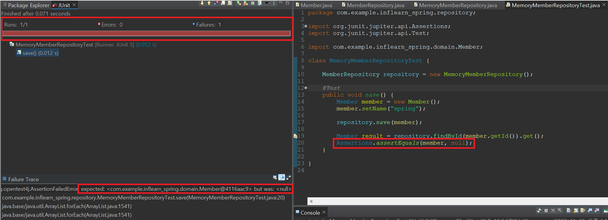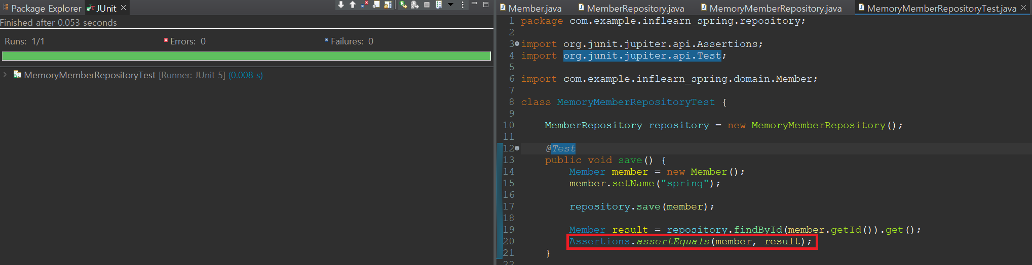 Assertions.assertEquals(member, result) 대신에 assertThat(member).isEqualTo(result)로 할 수 있다. 대신에 import static org.assertj.core.api.Assertions.assertThat을 import 해줘야 한다!