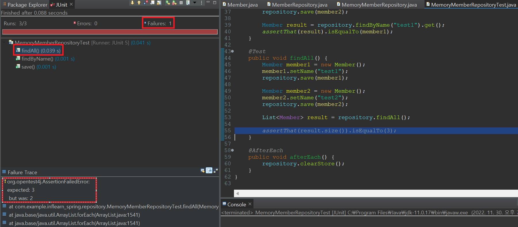 2022.03.09 - [Java/Spring입문] - Spring 입문(6) 회원관리 예제 - 백엔드 개발-1(테스트케이스작성까지)