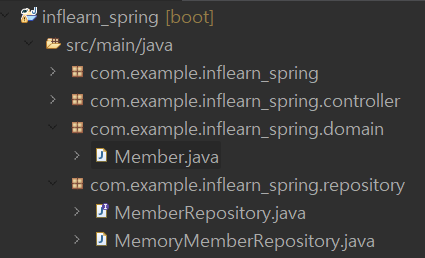 - repository -> MemberRepository Interface , MemoryMemberRepository implements MemberRepository