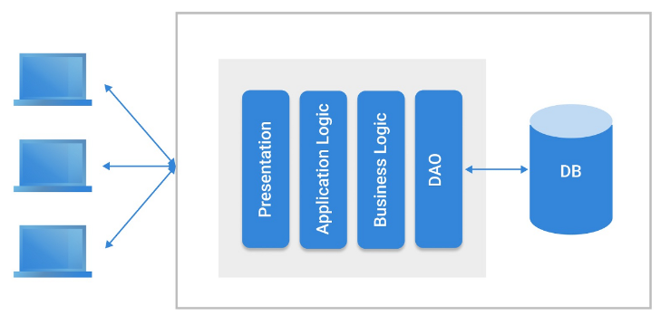 모놀리식 아키텍처는 마이크로서비스(MSA) 아키텍처에 반대되는 개념으로, 애플리케이션의 모든 구성 요소가 한 프로젝트에 통합되어 있는 형태