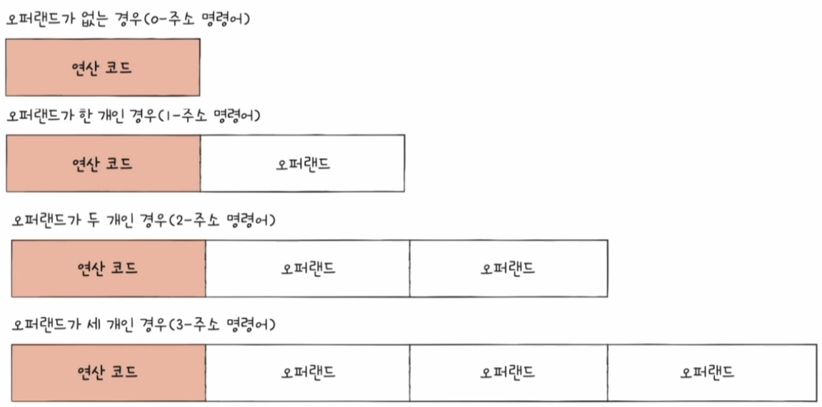 - 명령어는 연산 코드와 오퍼랜드로 구성된다.