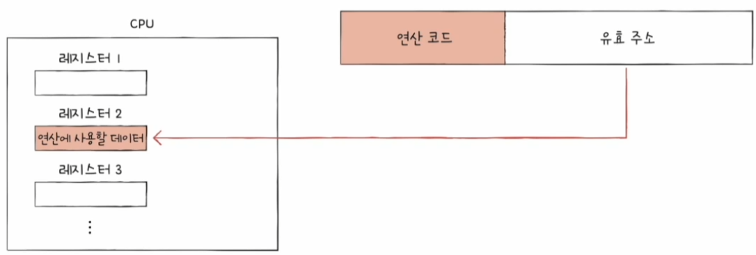 - 그 주소를 저장한 레지스터를 오퍼랜드 필드에 명시