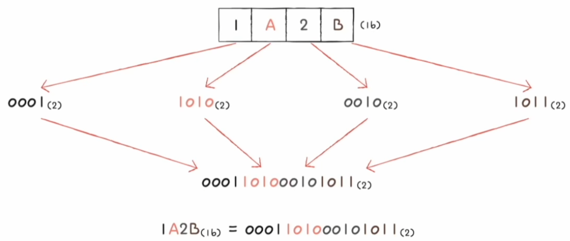 - 2바이트(1바이트) == 16비트(8비트) == 4자리 16진수로 표현