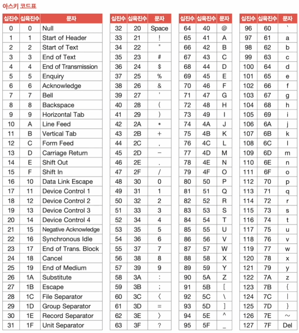 - 7비트로 하나의 문자 표현(128개의 문자표현 가능(2의 7승))