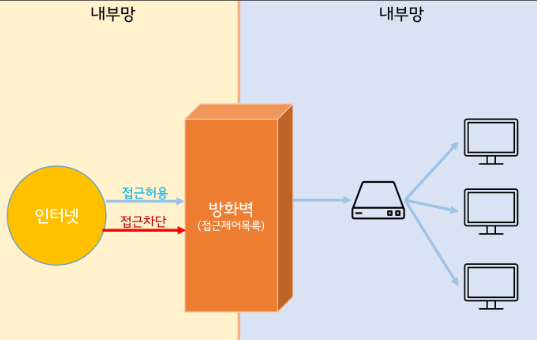 컴퓨터의 정보보안을 위해 정보통신망 외부 -> 내부, 내부->외부로의 불법 접근을 차단하는 시스템