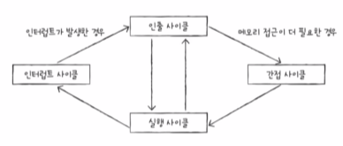- 어떤 명령어는 인출과 실행 사이클만으로 실행되고, 어떤 명령어는 인출, 간접, 실행 사이클을 거쳐 실행된다.