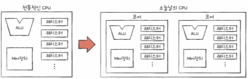 - 전통적으로 '명령어를 실행하는 부품'은 원칙적으로 하나만 존재하지만(CPU) 오늘날 CPU에는 '명령어를 실행하는 부품'이 여러 개 존재한다.