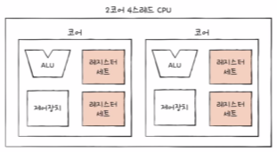 - 2코어 4스레드 CPU => 전체적으로는 2개의 코어가 움직이지만 그 안에 4개의 스레드가 실행된다.