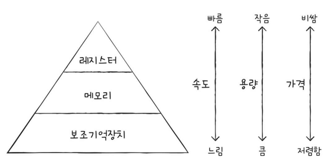 - 속도가 빠른 저장 장치는 저장 용량이 작고, 가격이 비싸다.