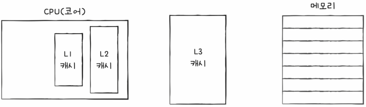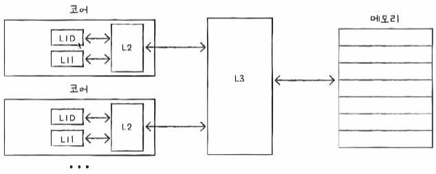 - 일반적으로 L1캐시와 L2캐시는 코어 내부에, L3캐시는 코어 외부에 위치해 있다.