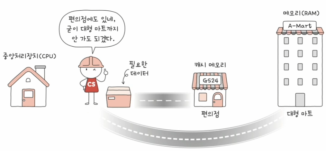 - "CPU가 매번 메모리에 왔다 갔다 하는 건 시간이 오래 걸리니, 메모리에서 CPU가 사용할 일부 데이터를 미리 캐시 메모리로 가지고 와서 쓰자"