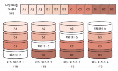 - 장점 : RAID 1보다 적은 하드 디스크로도 데이터를 안전하게 보관가능