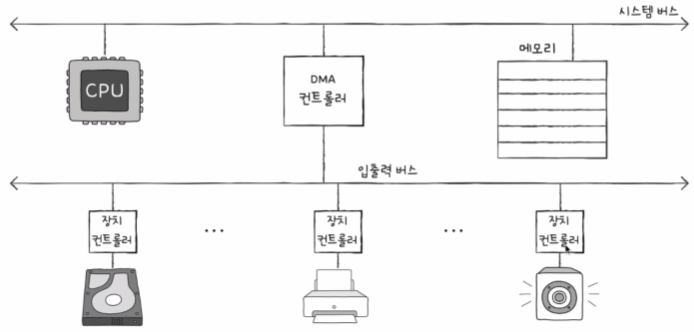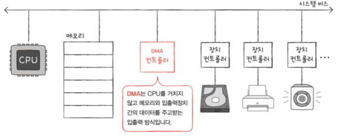 - DMA 컨트롤러는 CPU 대신 장치 컨트롤러와 상호작용하며 입출력 작업을 수행