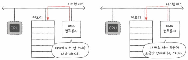 - 그래서 CPU가 시스템 버스를 사용할 때 DMA 컨트롤러는 시스템 버스를 사용할 수 없고, DMA 컨트롤러가 시스템 버스를 사용할 때는 CPU가 시스템 버스를 사용할 수 없음