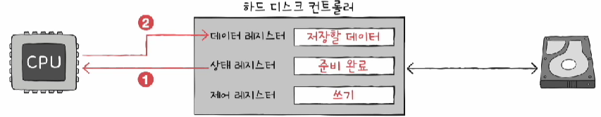 - '517번지를 읽어 들여라' == 프린터 상태 읽기, '518번지에 a를 써라' == 하드디스크에 a 쓰기