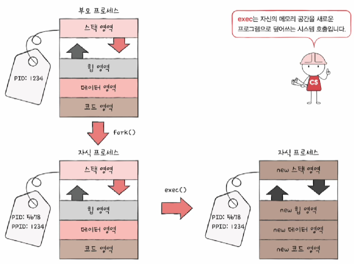 자식 프로세스는 exec 시스템 호출을 통해 자신의 메모리 공간을 다른 프로그램으로 교체