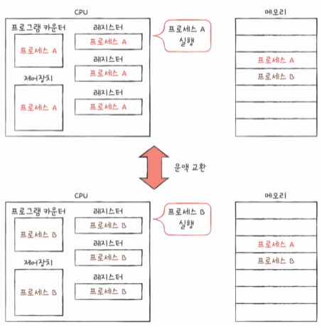 이처럼 기존의 실행 중인 프로세스 문맥을 백업하고 새로운 프로세스 실행을 위해 문맥을 복구하는 과정을 문맥 교환(context switching)이라고 한다.(여러 프로세스가 끊임없이 빠르게 번갈아 가며 실행되는 원리)