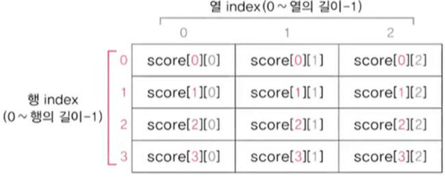 int[ ][ ] score = new int[4][3]; // 4행 3열의 2차원 배열 score를 생성