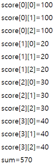 System.out.println(score[0][0]); // 배열 score의 1행 1열의 값을 출력