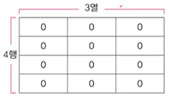 - 테이블 형태의 데이터를 저장하기 위한 배열이고 1차원 배열이 여러 개 모인 게 2차원 배열