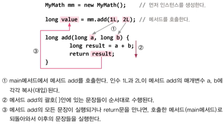 int result = add(3,5); // 메서드 add(int x, int y)를 호출하고, 결과를 result에 저장