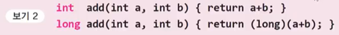 1번 조건인 메서드 이름이 add로 같고 2번 조건인 매개변수의 개수는 같지만 타입이 int와 long으로 다르기 때문에 조건 충족, 변환 타입은 long으로 같지만 변환 타입은 오버로딩의 조건에 영향을 미치지 않기 때문에 오버로딩이다!