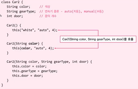 - 첫 번째 Car2( ), 두 번째 Car2( )가 세 번째의 초기화 값을 가져옴(코드의 중복을 제거하기 위해서)