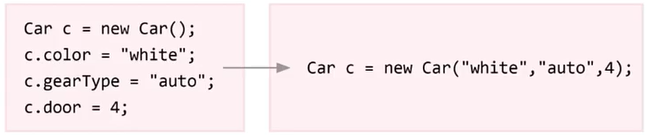 Car(String color, Stirng gearType, int door) { this.color = color; this.gearType = gearType; this.door = door; } |