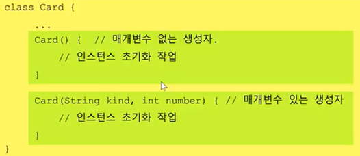 -> 생성자 오버로딩! ( 오버로딩의 조건에서 2번 매개변수의 개수의 차이(첫 번째 Card는 매개변수 없고, 두 번째 Card는 매개변수 두 개) 때문에 오버로딩이 가능하게 된다.)