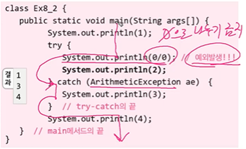 } catch (ArithmeticException ae) { // 예외 발생해서 첫 번째 catch블럭으로 이동