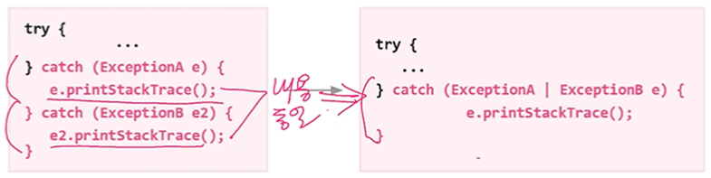 - 내용이 같은 catch블록을 하나로 합친 것(JDK1.7부터)